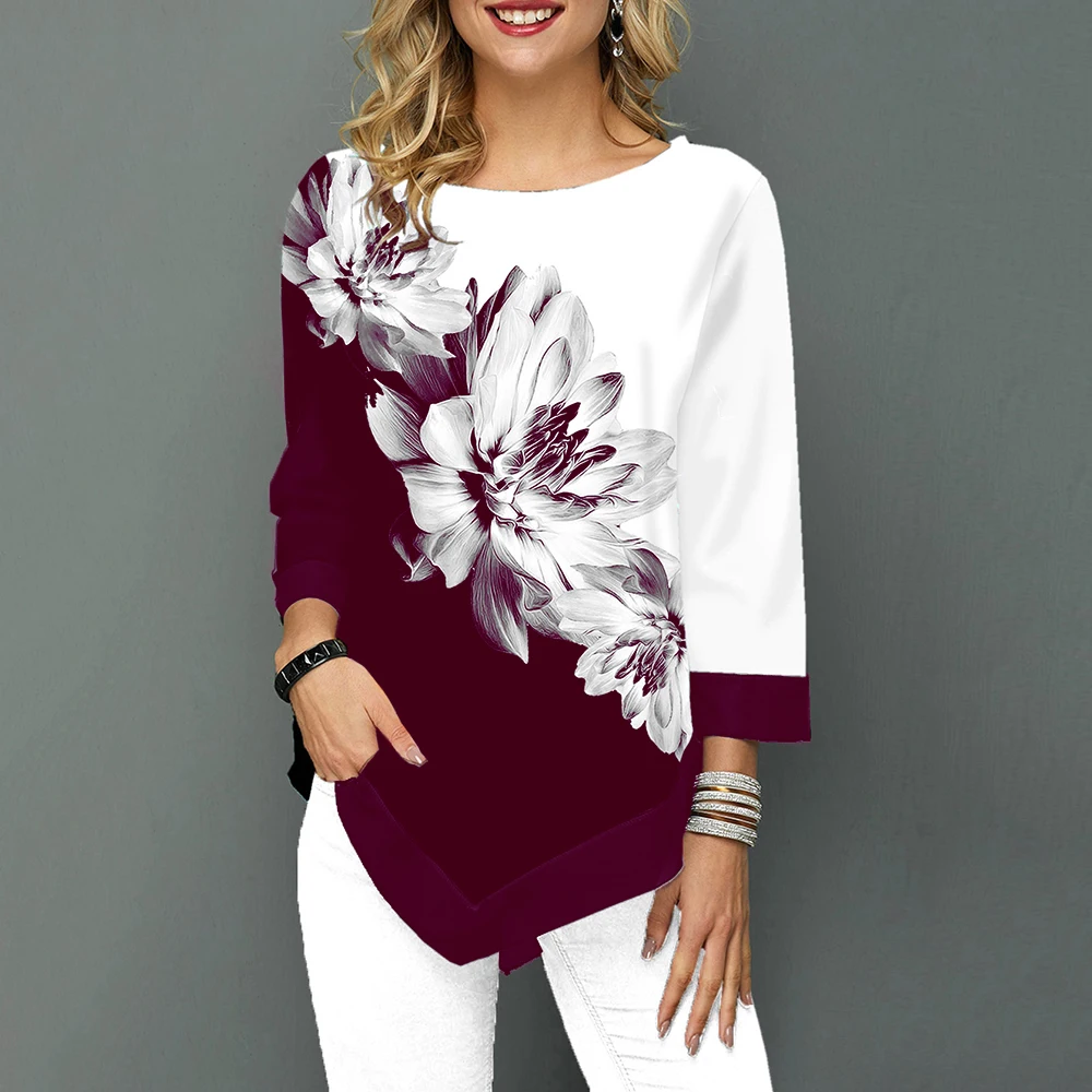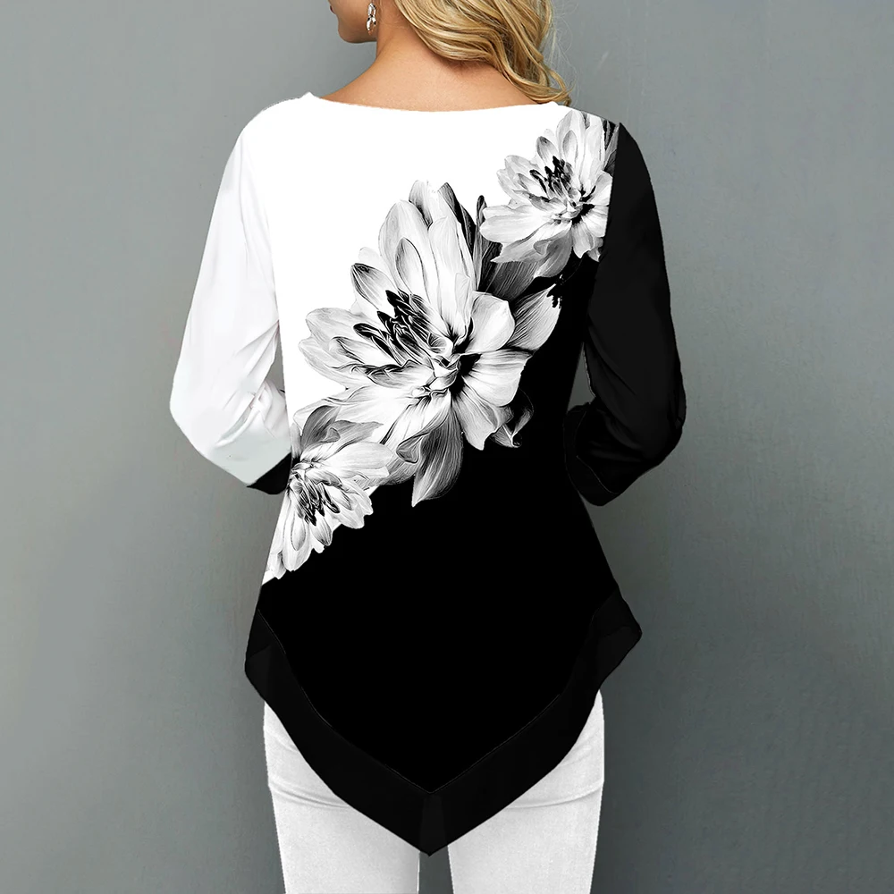 astounding Floral Printed Women Shirt Asymmetric Hem Autumn Blouse Shirt For Woman Flower Print Tops O Neck Bl