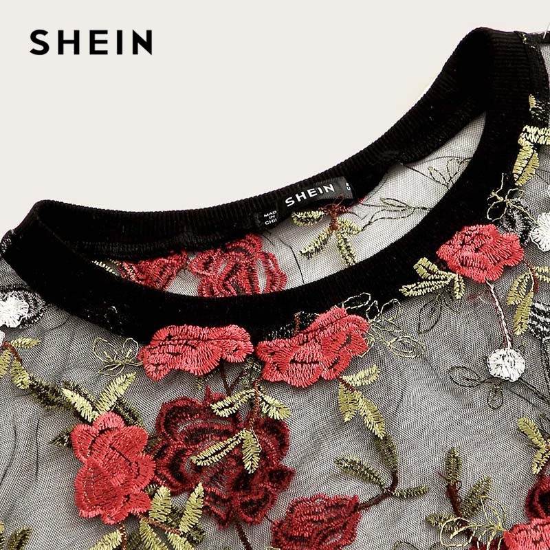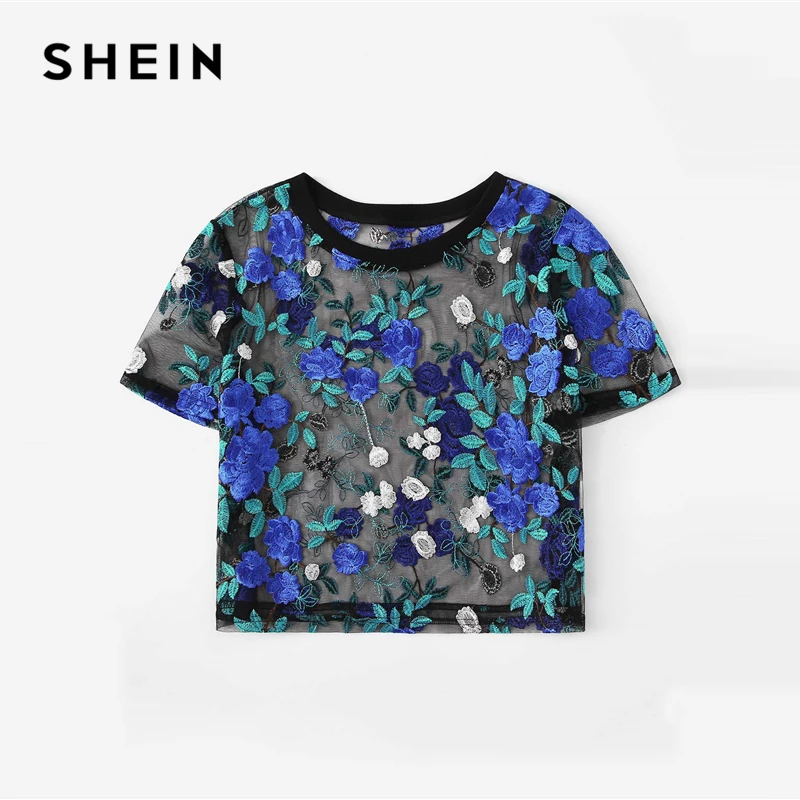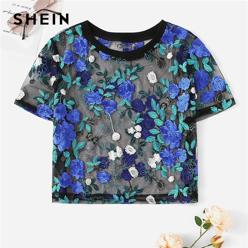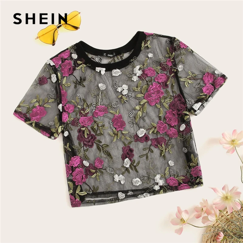 astounding SHEIN Boho Multicolor Floral Embroidery Sheer Mesh Sexy Crop Blouse Women Summer Round Neck Short S