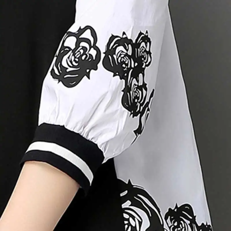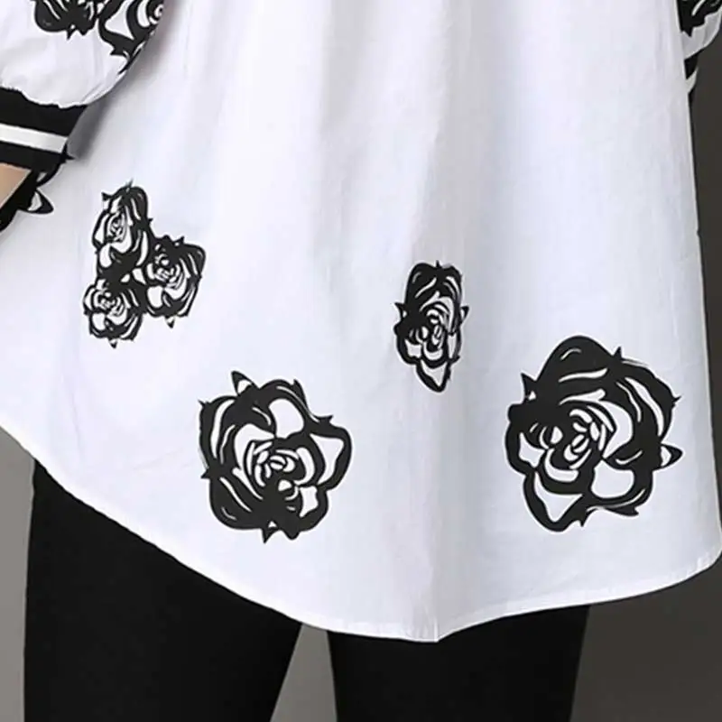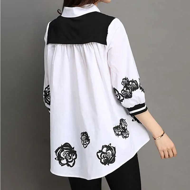 New 2019 New Spring Women's Plus Size Floral Print Button Fake Two Pieces Blouse Turn-down Three Quarte