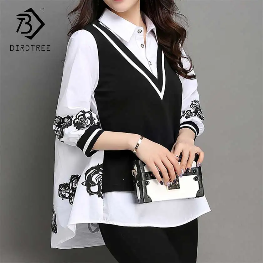 awesome 2019 New Spring Women's Plus Size Floral Print Button Fake Two Pieces Blouse Turn-down Three Quarte