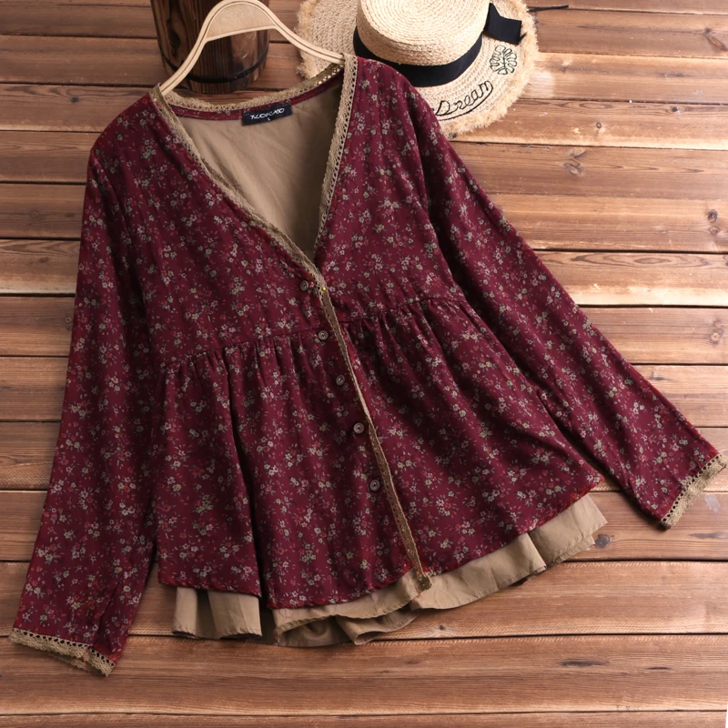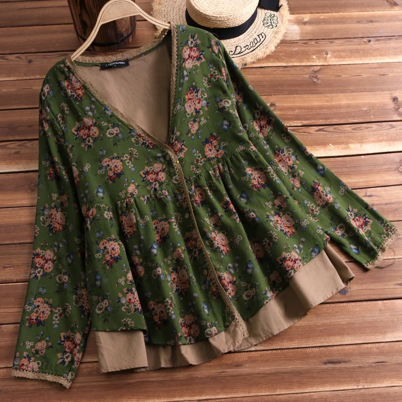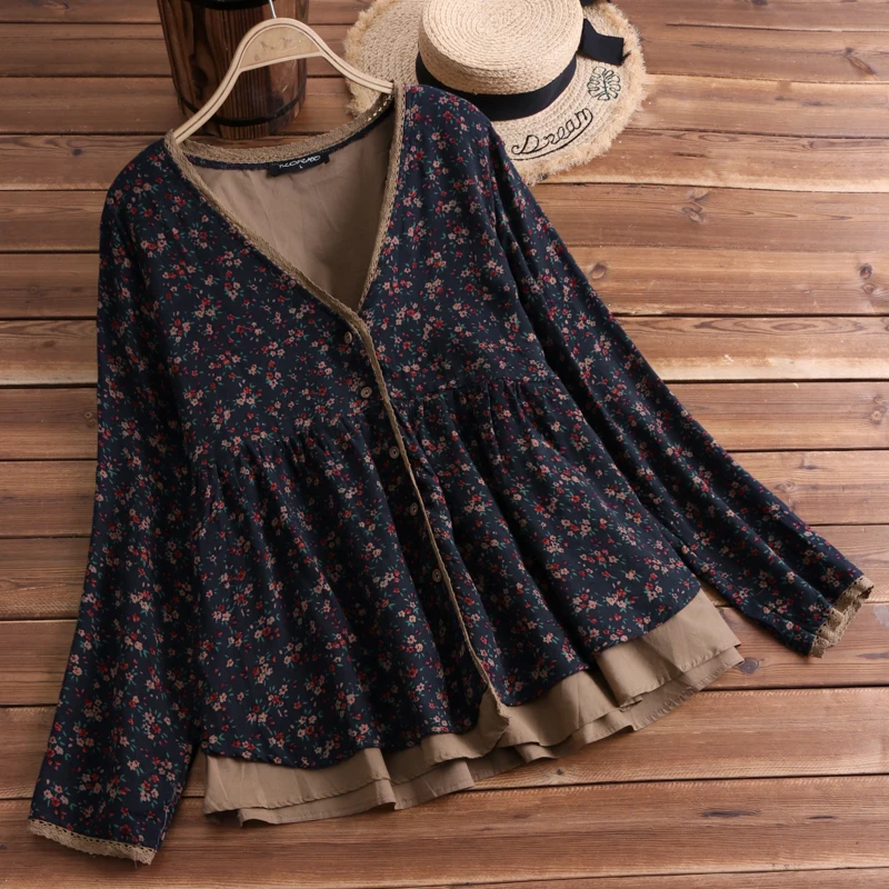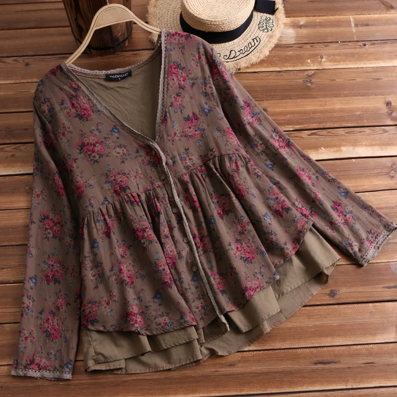 remarkable FLORHO Women Floral Blouse Vintage Lace Shirt V-Neck Cardigan Button Cotton Linen Loose Tops blusa
