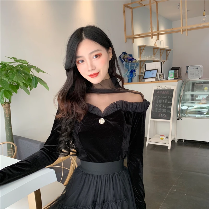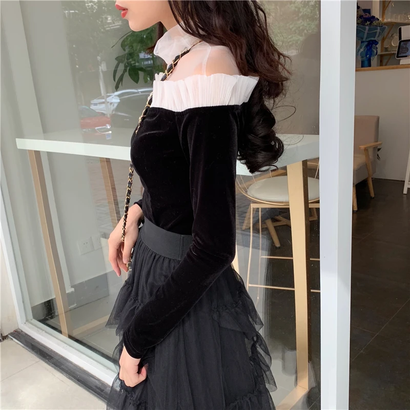 discount OllyMurs 2019 New Women Vintage Velour Bottoming Shirt Mesh Spliced Slim Ladies Tops Long Sleeve Fe