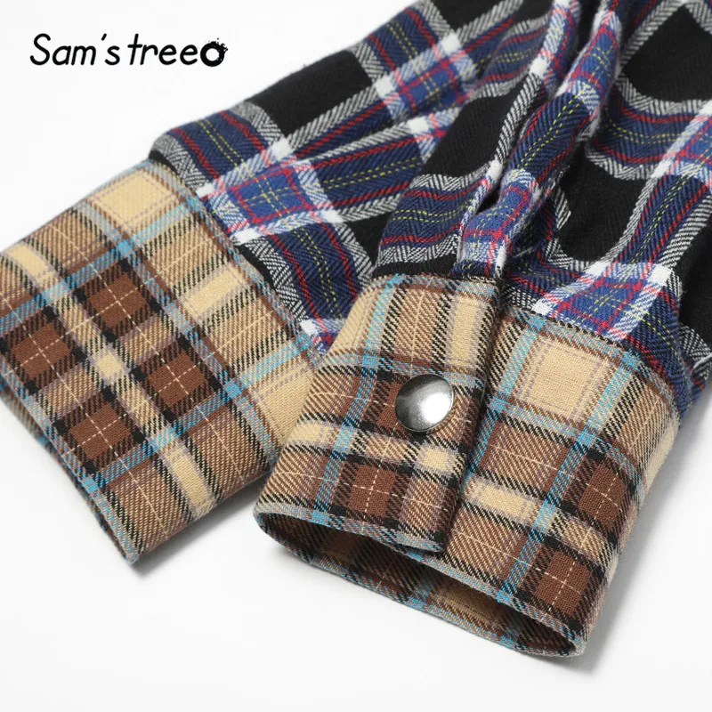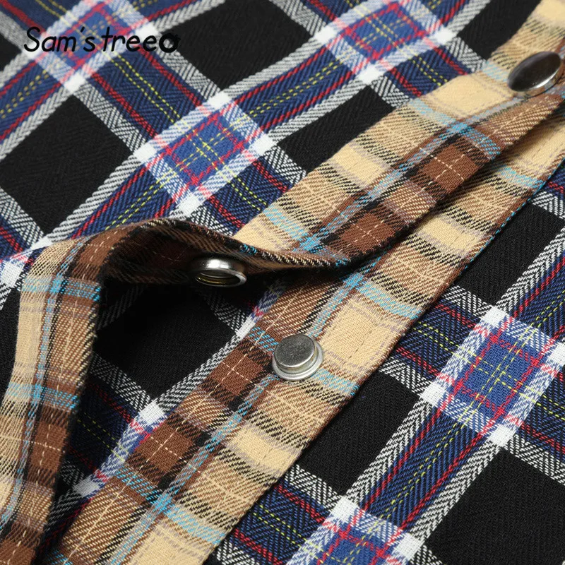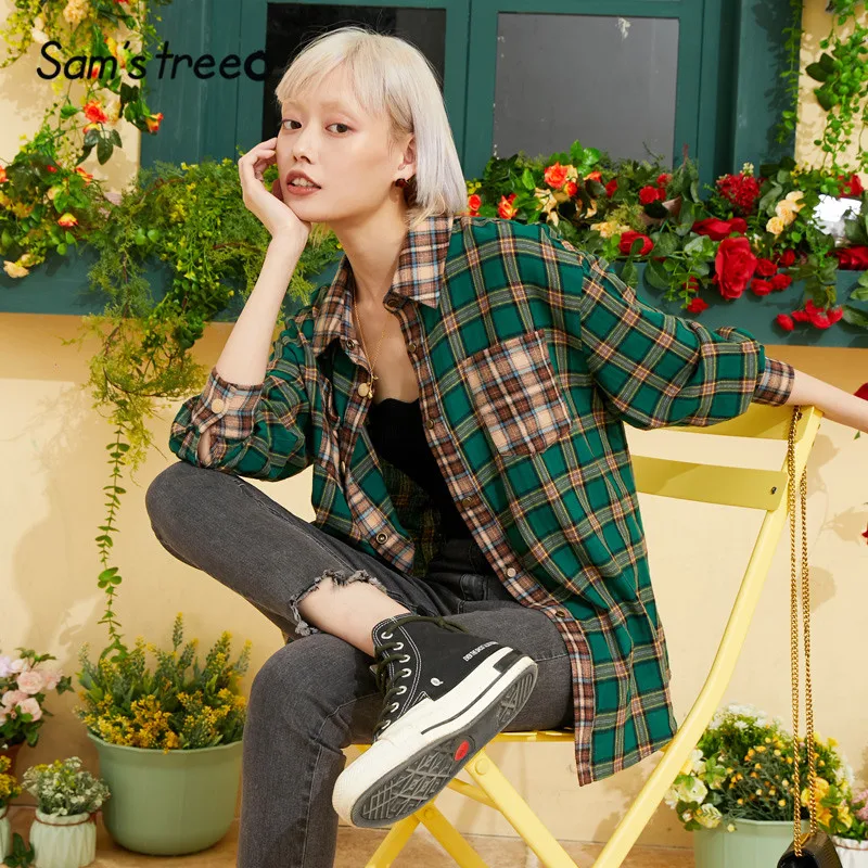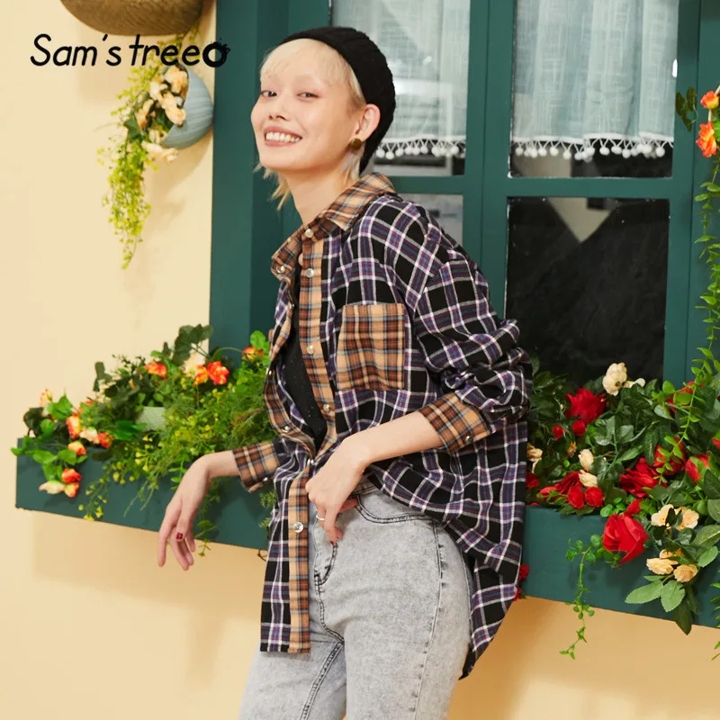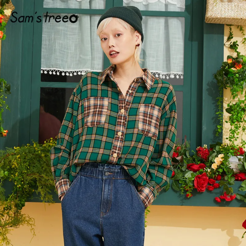 price cut Samstree Plaid Pocket Vintage British Blouse Shirt Women Top 2019 Autumn Long Sleeve Casual Fashion