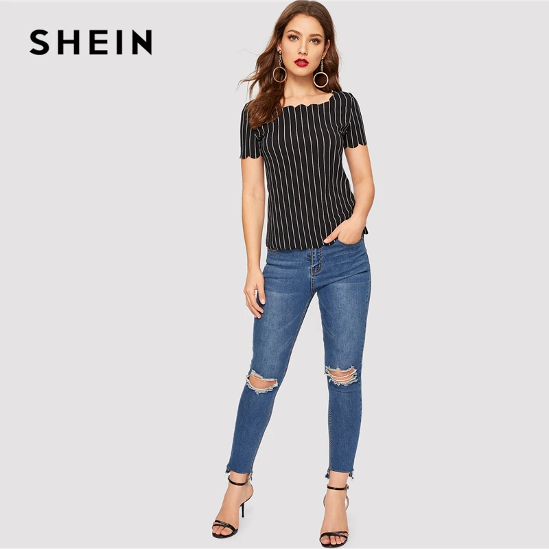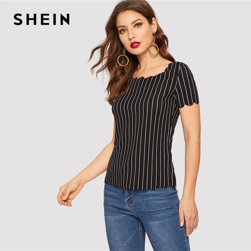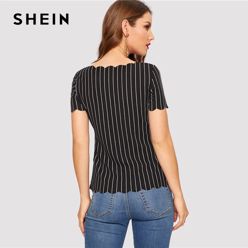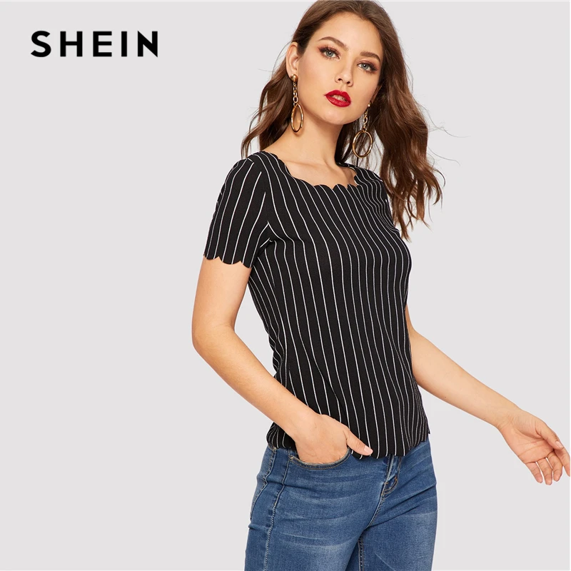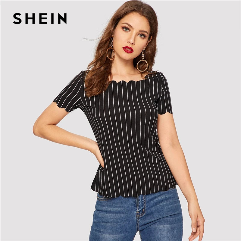 wonderful SHEIN Black Scallop Trim Striped Top Short Sleeve Blouse Women Summer 2019 Workwear Office Lady Cas
