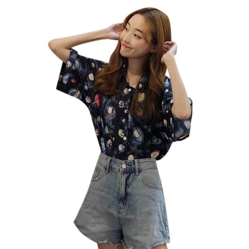 Most effective Women\'s retro cartoon planet printed shirt shirt summer short-sleeved lapel women\'s shirt sweet 2