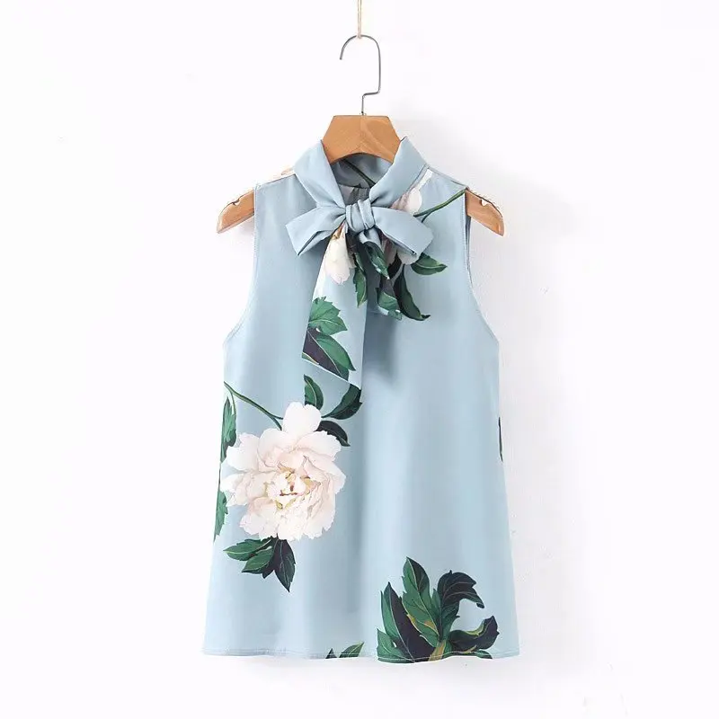 Very best 2019 new women elegant floral print casual smock blouses ladies sleeveless back bow tied chic shirt