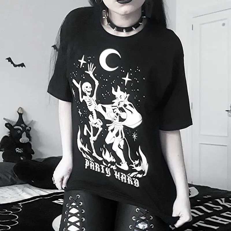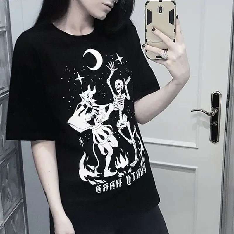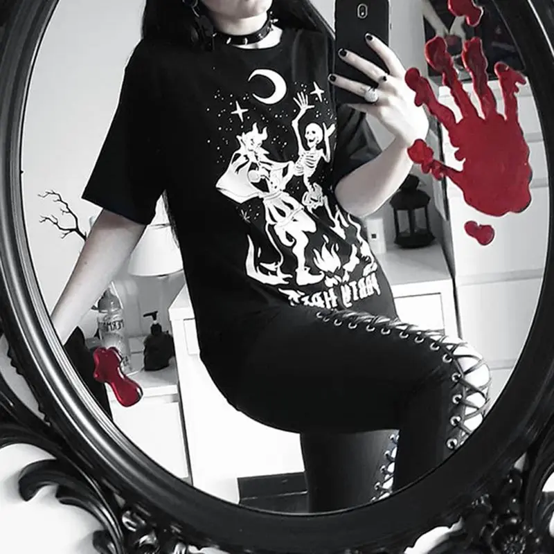 price cut Skull Print Gothic Streetwear Women Tshirt Summer Tops Loose Hipster Letter Black T Shirt Cool Girl