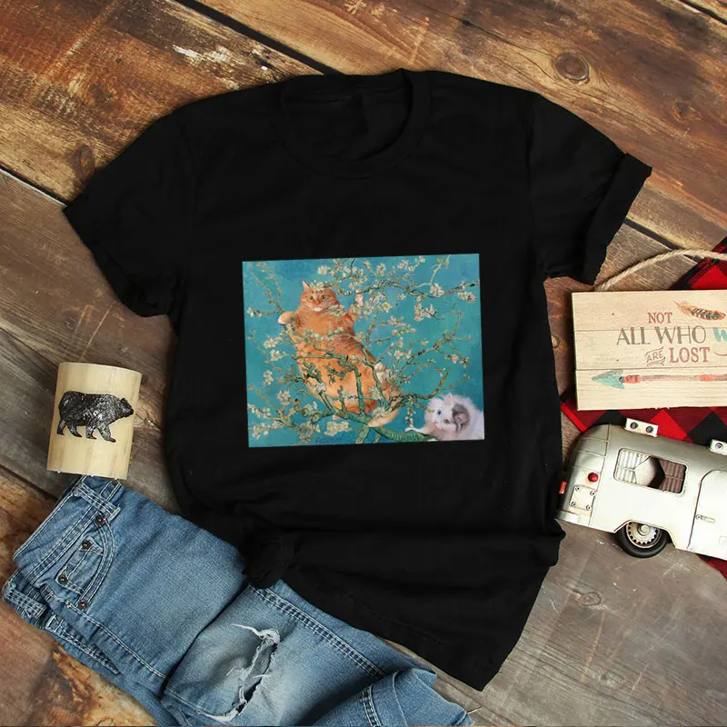 discount Van Gogh Cat 100% Cotton Women's T Shirt Art Oil Painting Print Cute Female T-shirt Casual Harajuku