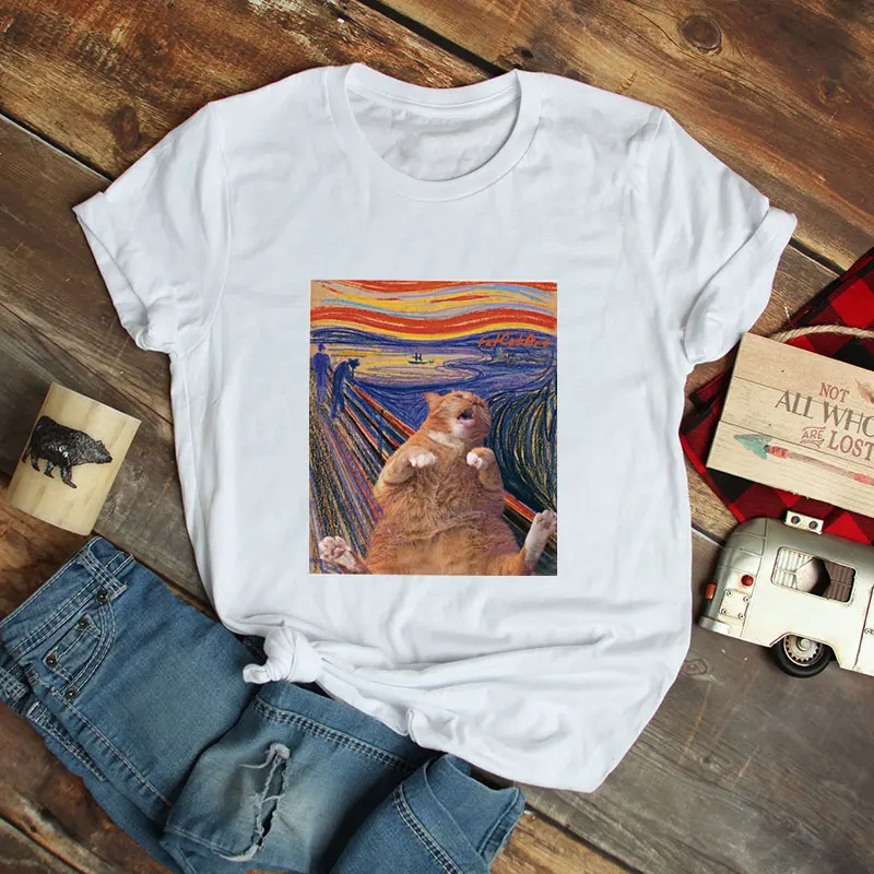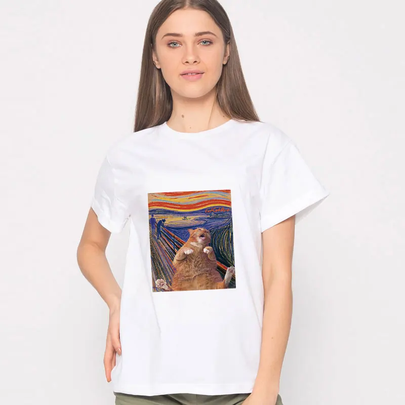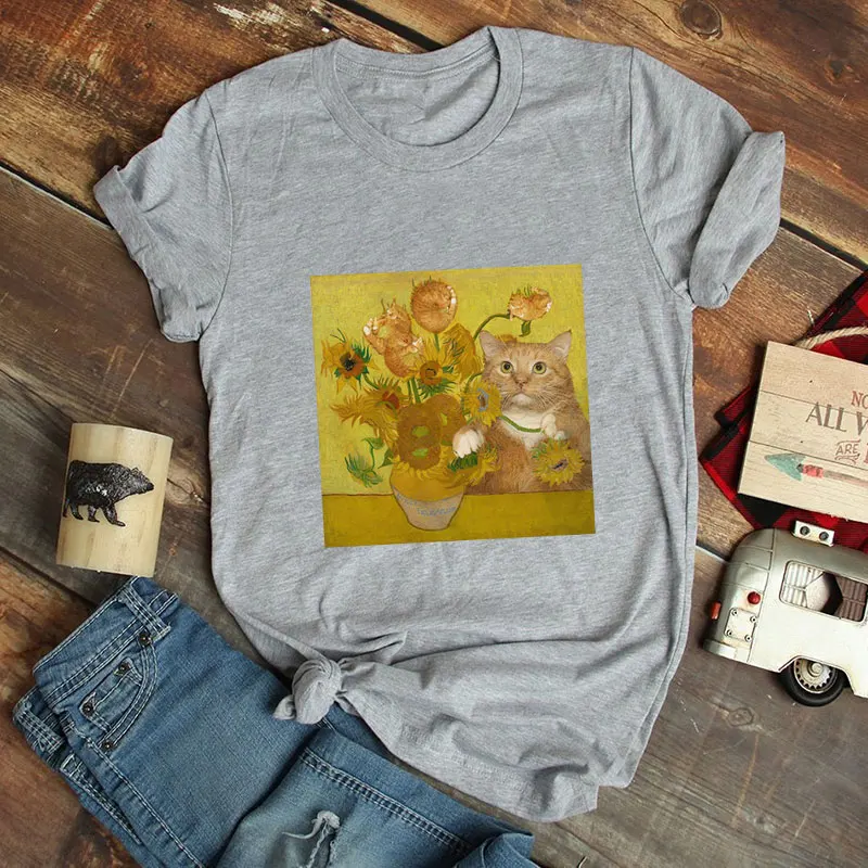 Greatest Van Gogh Cat 100% Cotton Women's T Shirt Art Oil Painting Print Cute Female T-shirt Casual Harajuku
