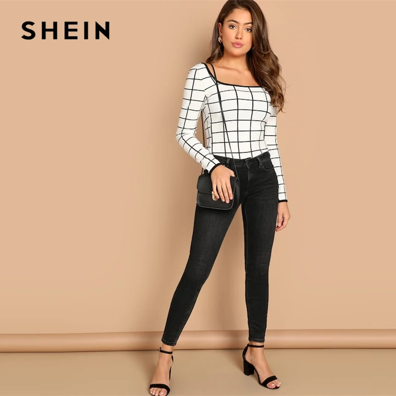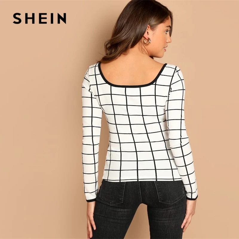 New SHEIN White Contrast Binding Grid Scoop Neck Slim Fit Long Sleeve Tee 2019 Spring Casual Women Mode