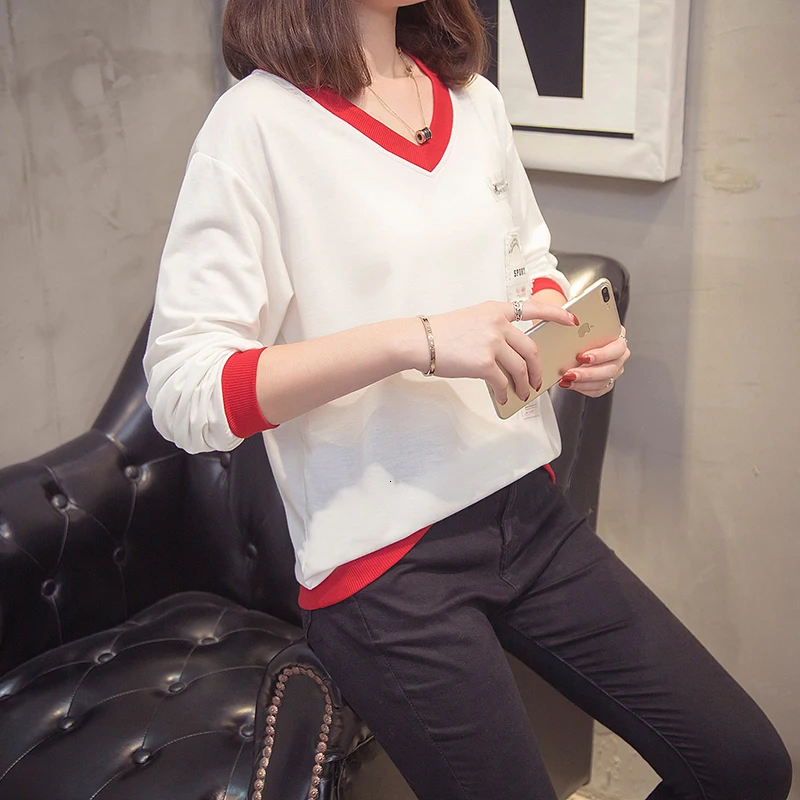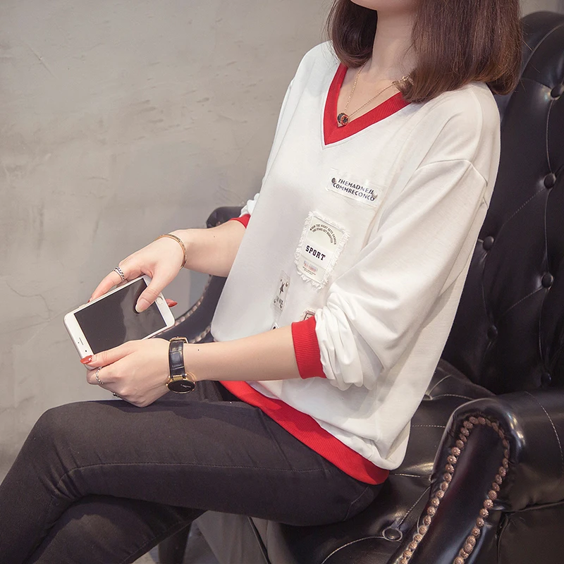 amazing Plus Size V Neck T-shirts Women Long Sleeve Top Tee Shirt 2019 Autumn Casual Loose Patch Spliced Ov