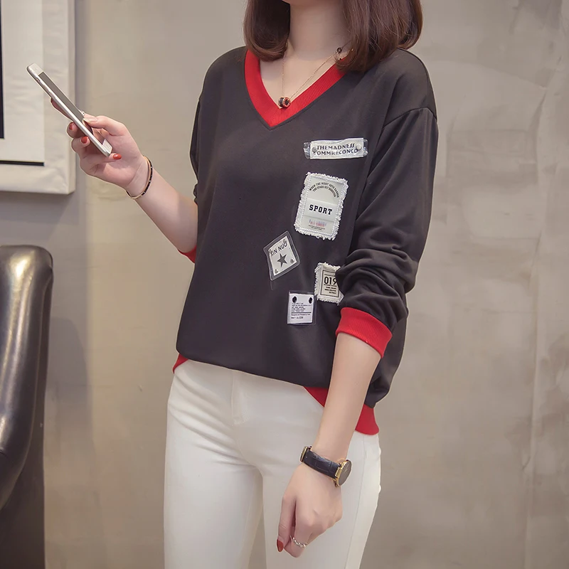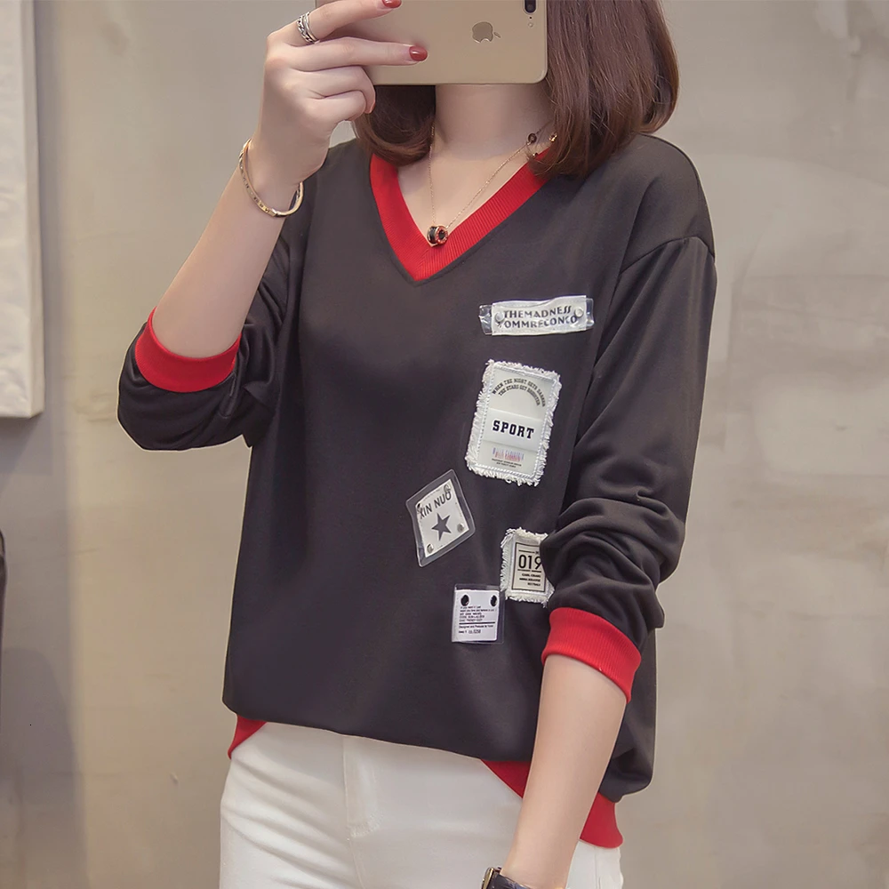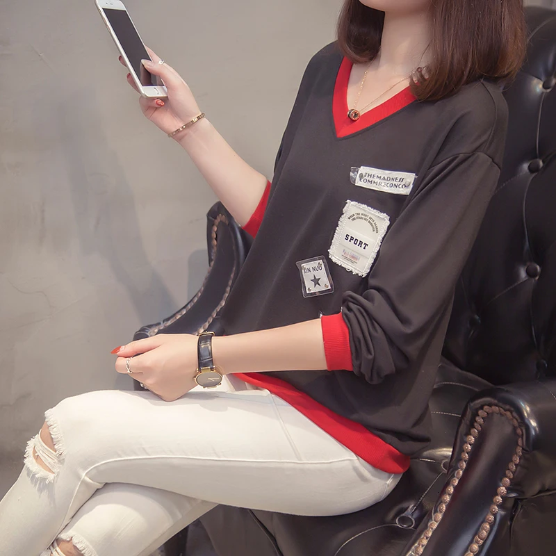 low cost Plus Size V Neck T-shirts Women Long Sleeve Top Tee Shirt 2019 Autumn Casual Loose Patch Spliced Ov