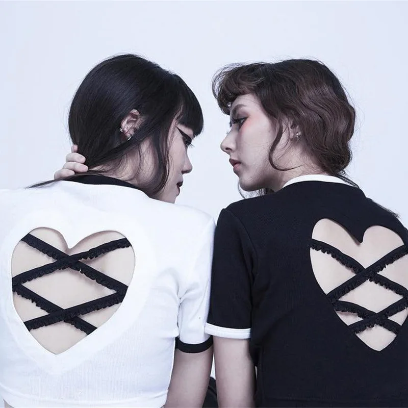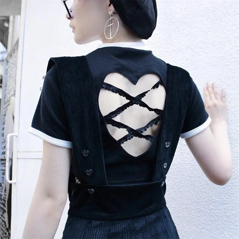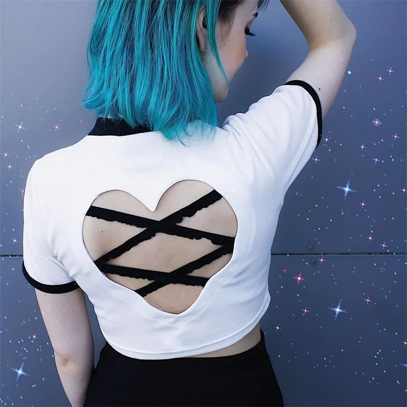 low cost Sexy Women T-Shirts Summer Hollow Out Tshirt Backless Short Sleeve Cute Crop Top Kawaii Harajuku Be
