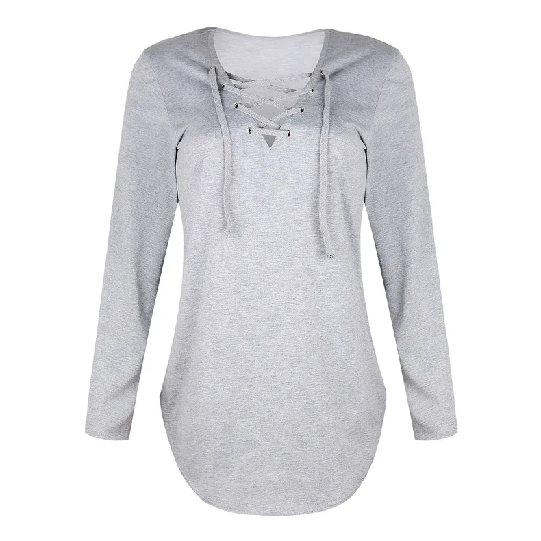 price cut Bandage long sleeve t shirt women autumn tops cross bandage neck tshirt S-2XL plus size winter tops