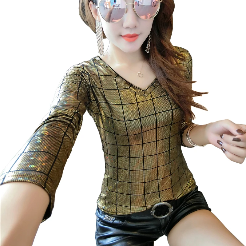 price cut Plaid T Shirt Women 2018 Autumn V Neck Long Sleeve Shining T-Shirt Female Bright Bronzing Silver Go