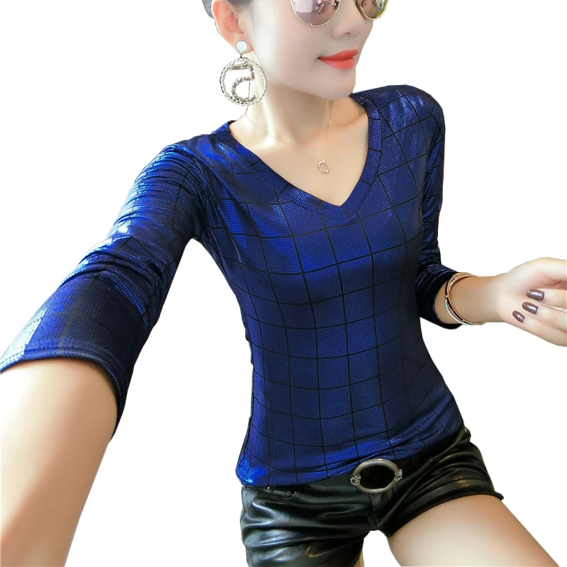 Greatest Plaid T Shirt Women 2018 Autumn V Neck Long Sleeve Shining T-Shirt Female Bright Bronzing Silver Go